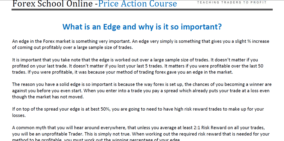 The Forex School Online course is a 126 page PDF that traders are encouraged to read (and re-read) slowly so that they can fully understand the intricacies of price action trading. Mr. Fox makes an effort to explain the concept from start to finish, and to emphasize the risk to reward ratio, so that traders can understand exactly what they’re getting into. Unlike many other trading strategies, price action trading needn’t be extremely risky, making it a good option for those new to Forex trading.