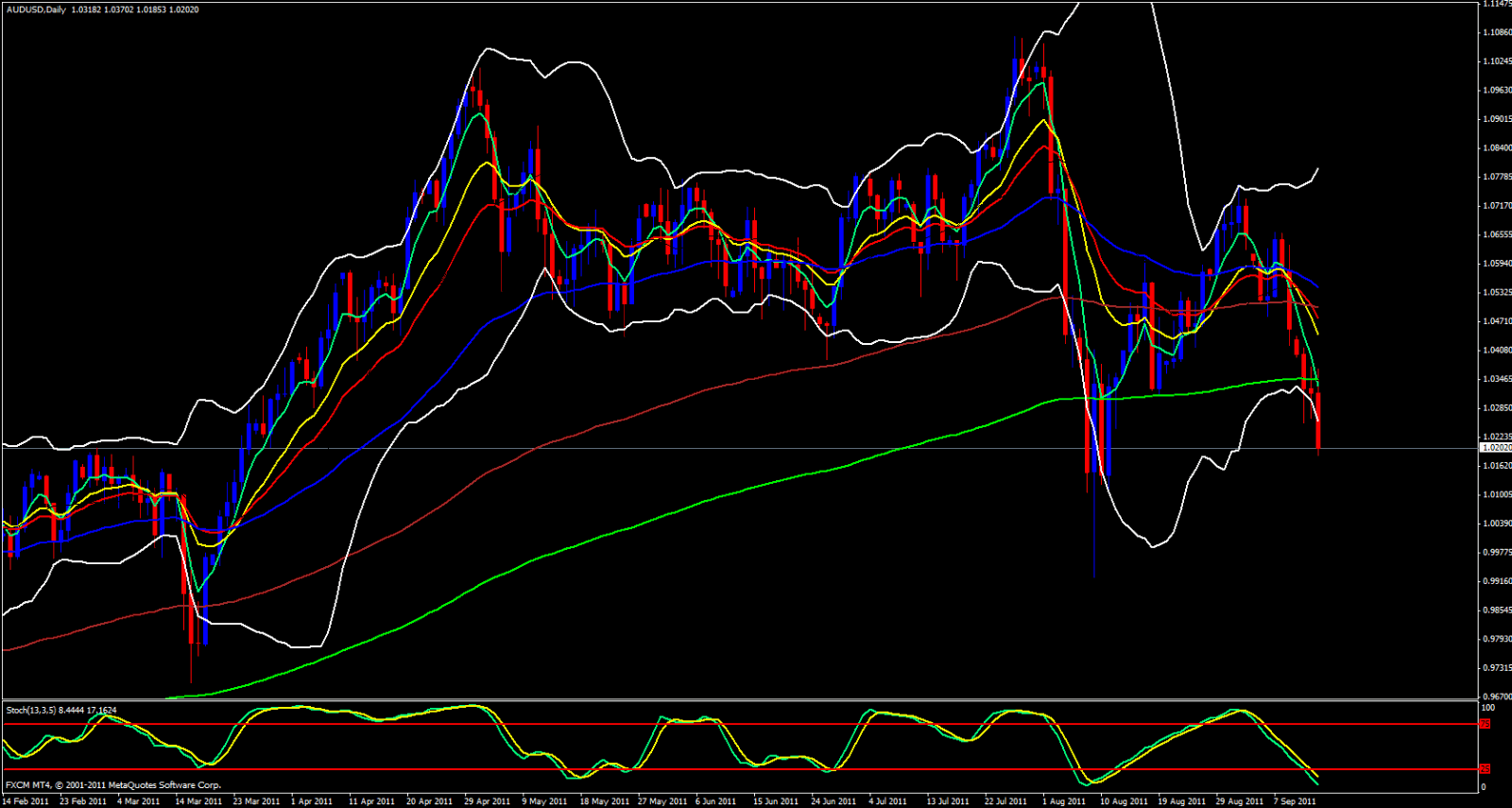 Either price is finally going to bounce off the Weekly 55 ema combined with the lower Bollinger Band then keep heading back up along the 21 ema as it has been for several weeks now, or will price get pushed through the 55 ema and bust through it then head down to the 144 or 233 ema we will just have to find out but it will be very soon. The weekly 5 ema has crossed below the other ema's and it appears to be forcing price downward.
