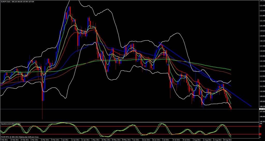 The eurjpy continues to look perfectly bearish. There is absolutely no reason to considering anything but short positions with this pair. This pair is gracefully riding the ema's on all time frames from the weekly all the way down to the 1 minute. At the time I am analyzing this pair I see it is up against the August low of 108.01 with the 4 hour 13 ema just a bit above it and it looks to me it will crunch this pair down below the low.