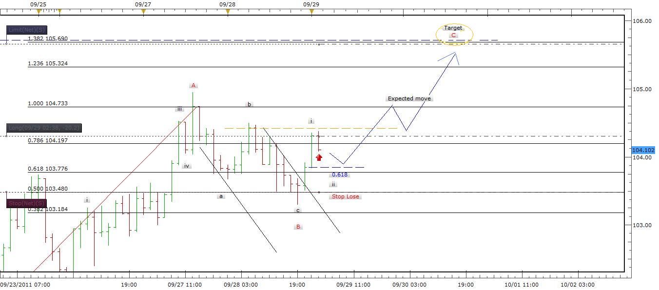 Preferred action: To buy once trend comes closer to or touch 103.850 price point 0.618 Fib level.