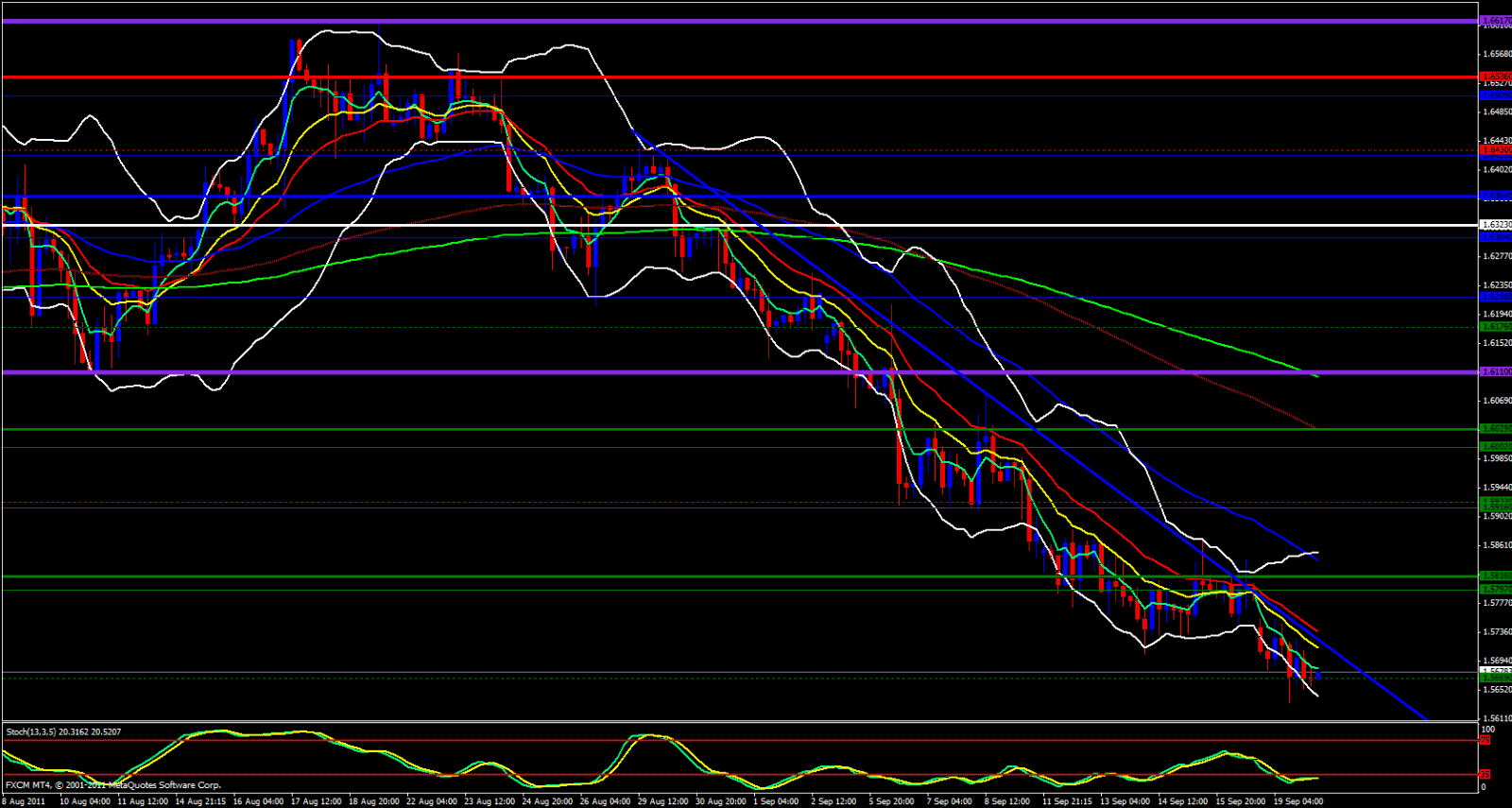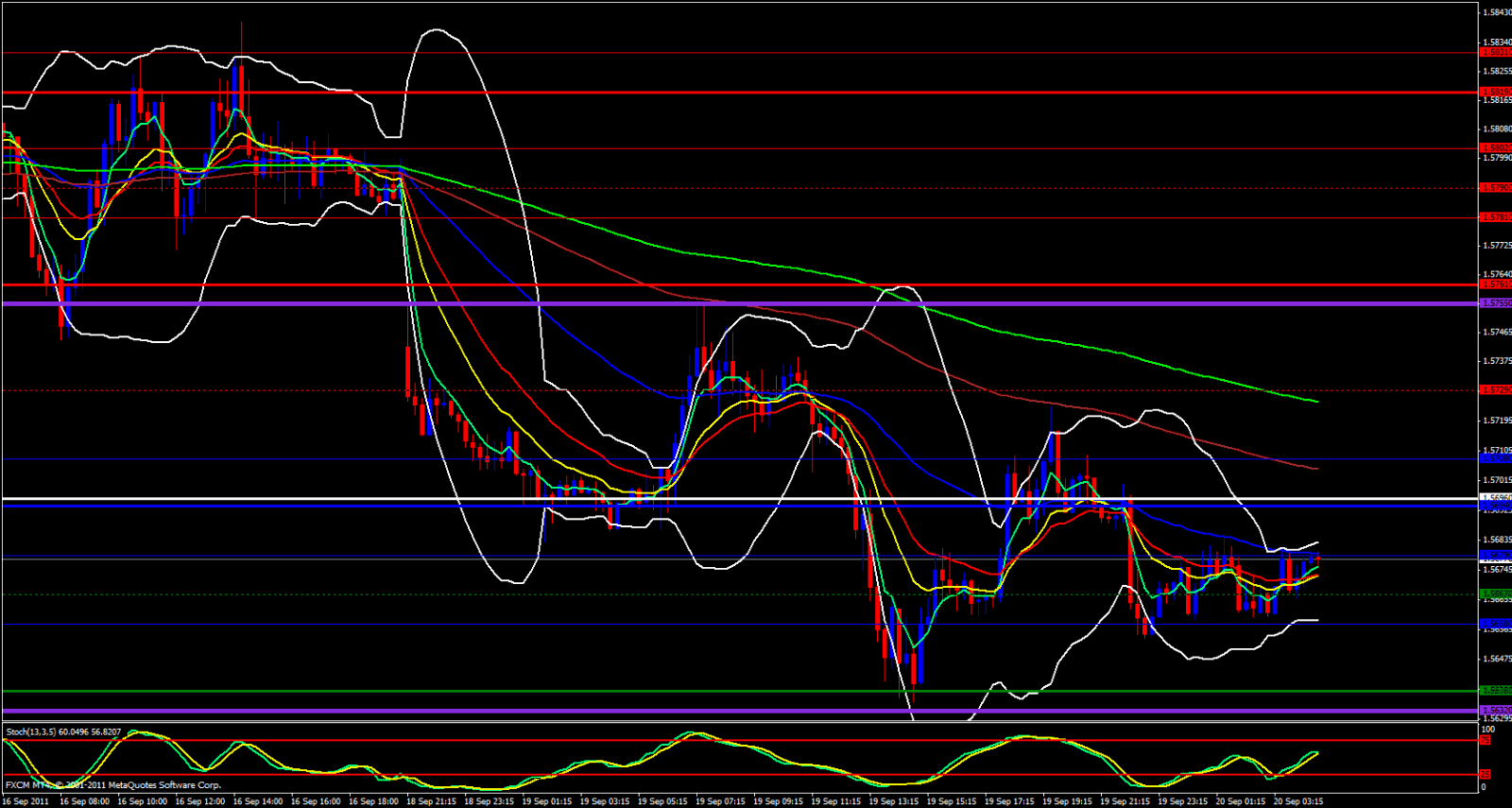 Now, looking at the 15 minute chart I see that the 5 has crossed above the 13 and the 21 ema's and the upper Bollinger Band is pointing upward giving price permission to head up. The Daily 5 is at 1.5720 but will come down a bit because price will drag it down, and at the 1.5708 region we have the 15 minute 144 ema, and at the 1.5720 region we also have the hourly 55 ema and the 4 hour 13 ema is on the 1.5713 area. So I think it is likely for price to head in that direction, somewhere in between 1.5710 - 1.5720 region then drop from there.