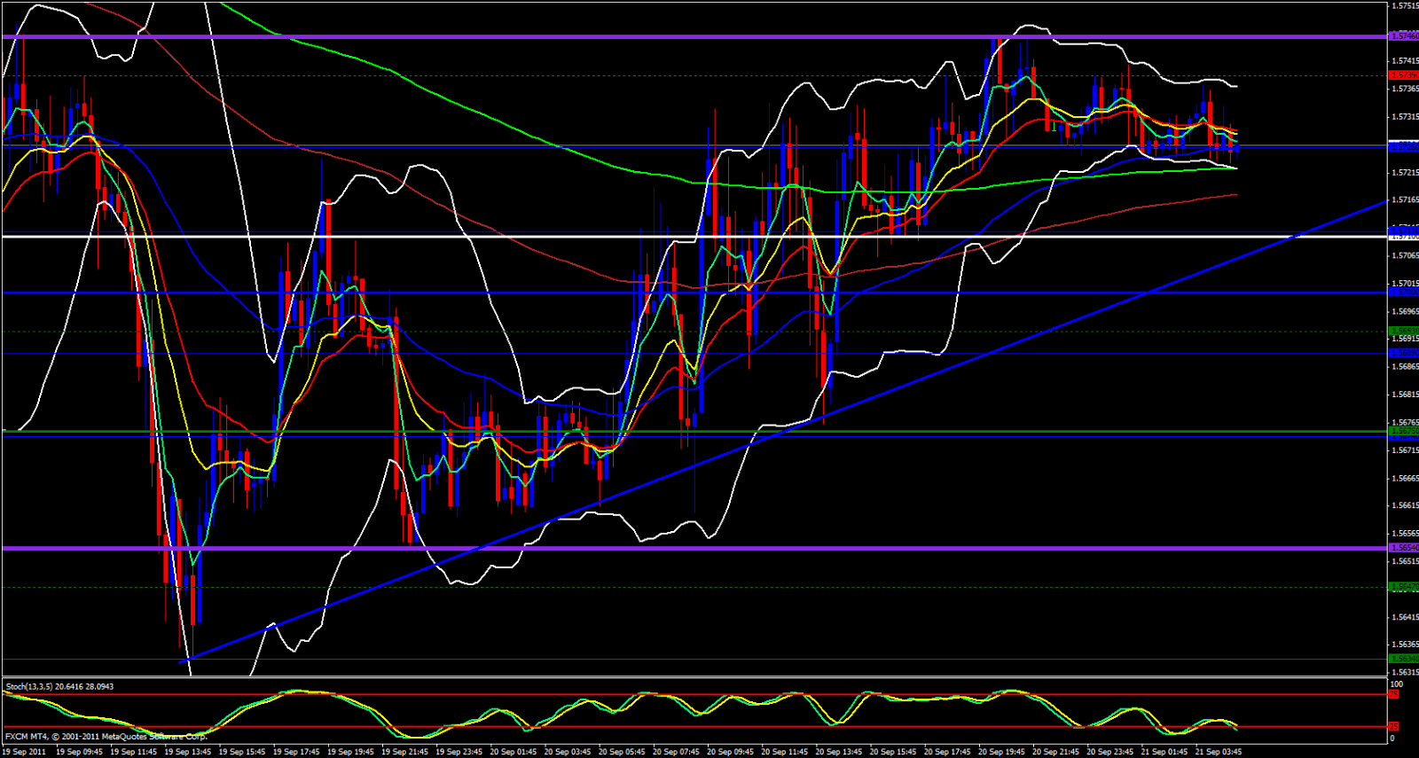 Looking at the 15 minute chart price has rolled over below the ema's, however, the ema's are braiding therefore there is no speed or momentum at this time. Price is however, just above the 233 ema so I guess we will just have to wait and see if the 233 breaks. If it does break then we still have the 144 to contend with and there will be strong support at the 1.5710 area since that is the intersection of the daily central pivot point and the trend line. If price reaches that area I would then check to see where the EUR/GBP and USD/CHF is and if I have a EUR/GBP and USD/CHF at resistance then i will have GBP strength and USD weakness and I will feel confident about taking that long GBP/USD long.