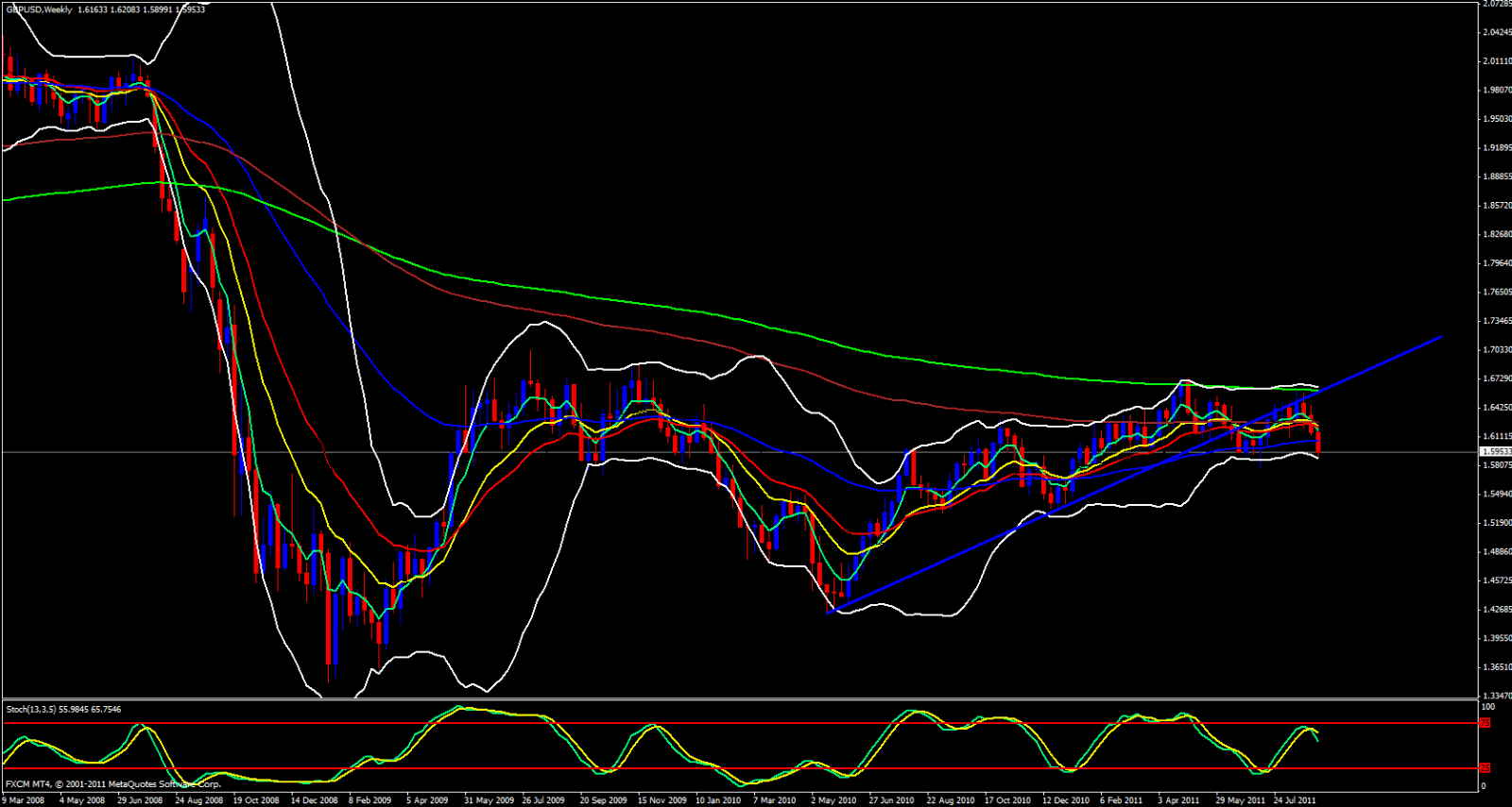 This pair appears to be in the beginning of a breakout if watching it on a Weekly chart. It has busted and retested the weekly Trend line, has busted the weekly 55 ema with the lower Bollinger Band pointing down, the 5 ema is crossing the other ema's and stochastics has crossed downward.