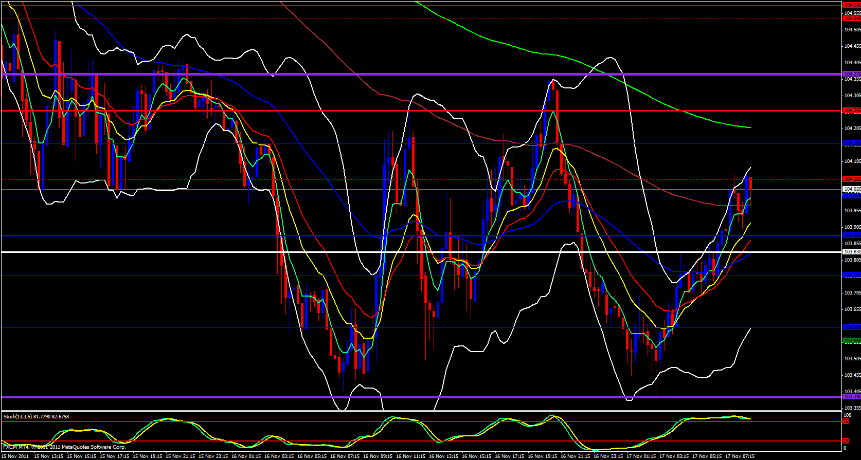 On the 15 minute timeframe the 233 ema is also a around 104.20 with the daily R1 at 104.26 and yesterdays high at around 104.37 The 15 minute stochastics is in the overbought zone and price keeps touching the upper Bollinger band. More than likely, price should turn around and start to drop between 104.20 - 104.50 .
