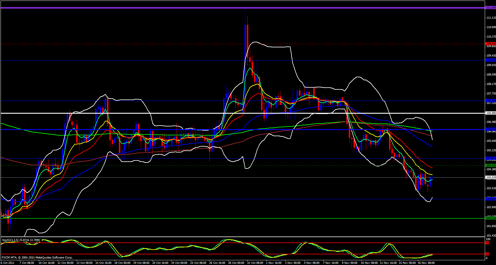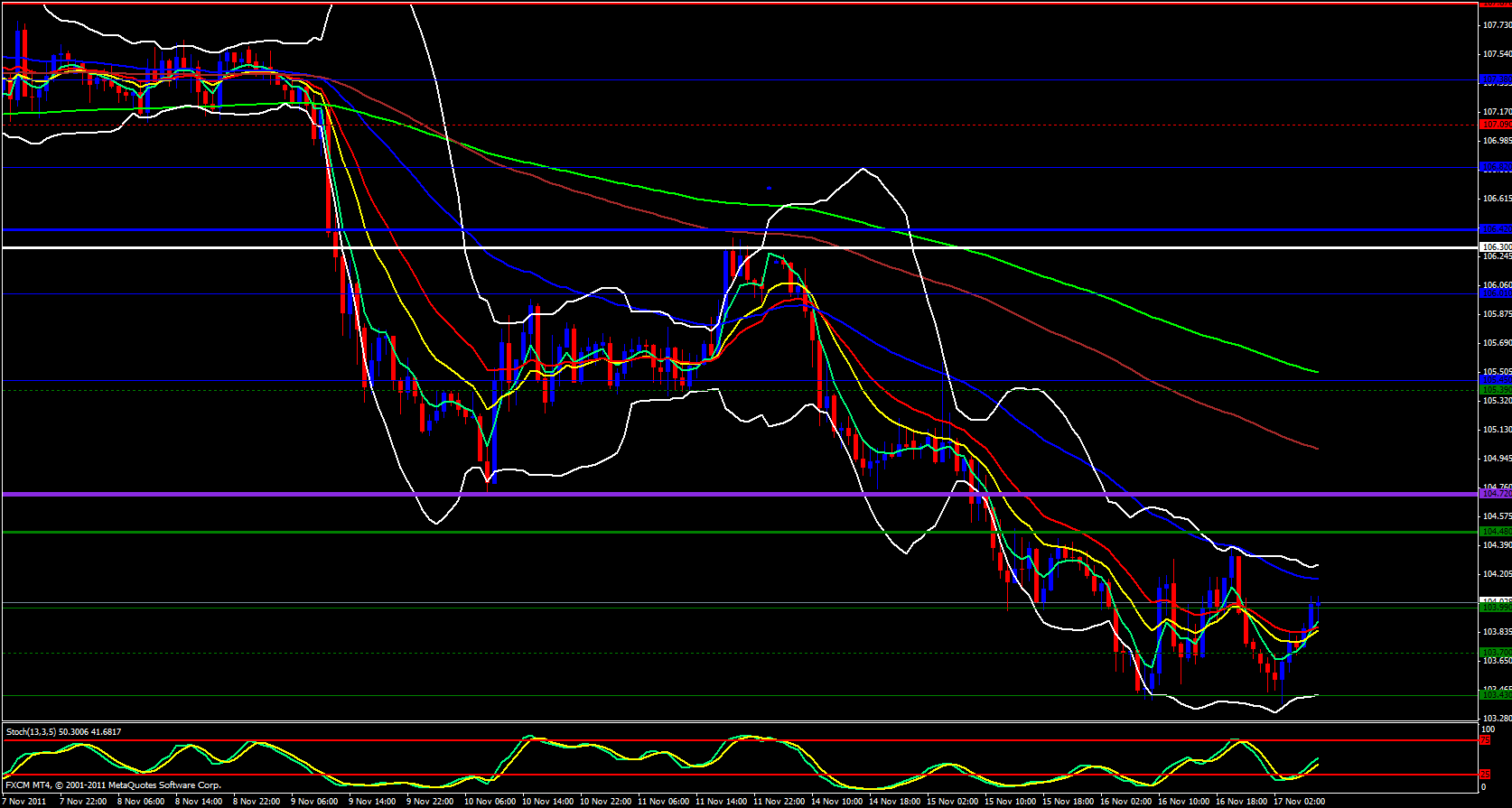 On the 1 hour chart timeframe the 55 ema has proven to be strong resistance and the hourly 55 ema stands at around 104.17 with an upper Bollinger band just above the 55. There is a slight chance that this 55 ema could act as strong resistance and stop price from going any higher so I would keep an eye at that level.