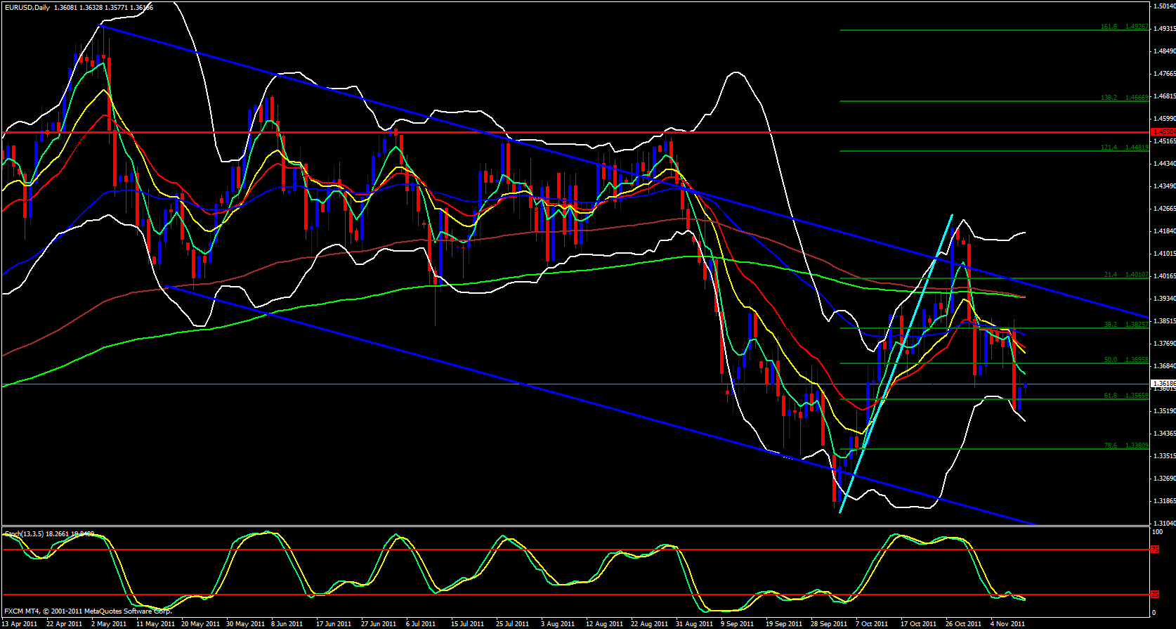For EUR/USD today I will begin with the daily timeframe. Yesterday it just pierced the 61.8 fib to the upside, however, it is still below the 5 ema which is forcing it down.