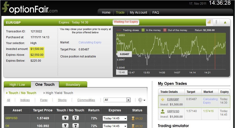 With optionFair™ Binary Options Trading Platform, I traded $1,500 on the “High” instrument. This kind of option has a return of 70% if the option expires above the strike price. If the signal is correct, I could get a return of $1,050 on my investment. The strike price for the EUR/GBP at the buying time (14:13) was 0.85226 for the expiration of 14:30. The EUR/GBP did go up and the option expired at 0.85487, above the strike price, and I earned $1,050 in 17 minutes!