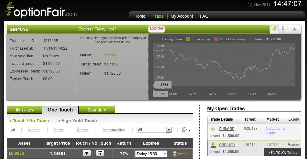 With optionFair™ Binary Options Trading Platform, I traded on a $1,000 on the “No Touch” instrument. This kind of option has a return of 72% if the option will expire without touching the strike price. I could get a return of $720 on my investment if Doug’s signal is correct. The market price for the GBP/USD at the buying time (14:22) was 1.57140 and the target price for the 14:45 expiration was 1.57476. The GBP/USD expired without touching the strike price and I won $720 in 23 minutes.