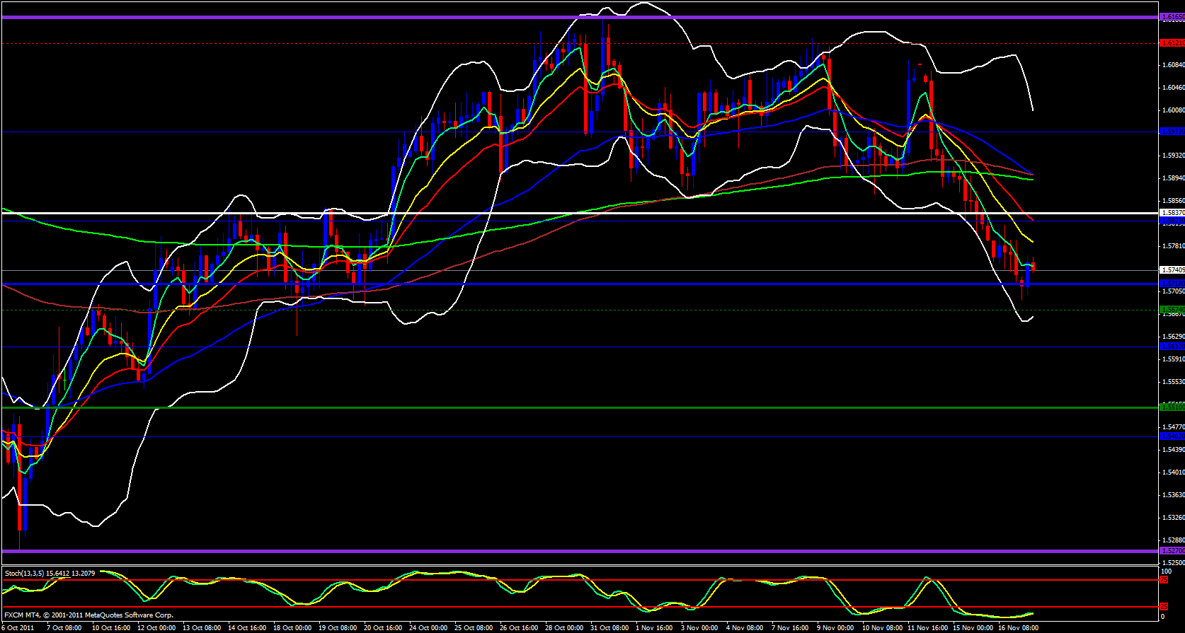 If price breaks through the 13 ema thent he 21 ema stands not to far above and is overlapped with the monthly central pivot point at 1.5837 On the hourly timeframe price seems to be drifting up and the 5 ema is trying to cross above the 13 ema and the stochastics is pointing up but at this time has reached the weekly S2 at 1.5764 where price is having a fight.