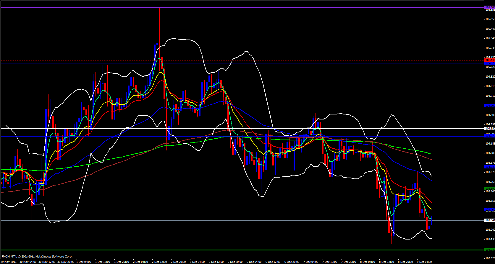 Moving on to the hourly time frame price is riding the 5 ema to the downside and the 5 ema has crossed below the 13 ema and the lower Bollinger band is pointing down. The weekly S1 pivot is at 103.02 and a bounce is expected at that level offering a small scalp to the upside then a good opportunity to enter a short position.