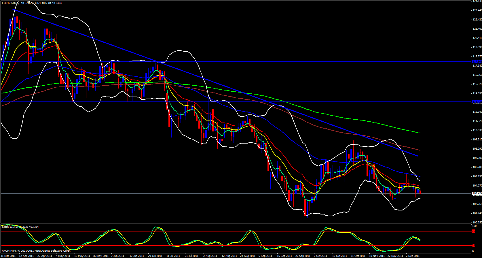The EUR/JPY weekly candle opens up just below the 5 ema and looks like it wants to head down. It can still head up a bit and pierce the 5 ema and possibly even head up to the 13 ema which is where price should be rejected but that could be a couple hundred pips up.