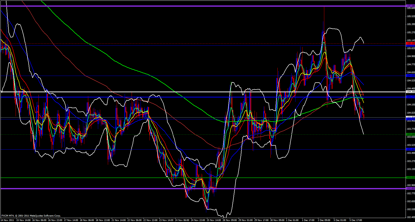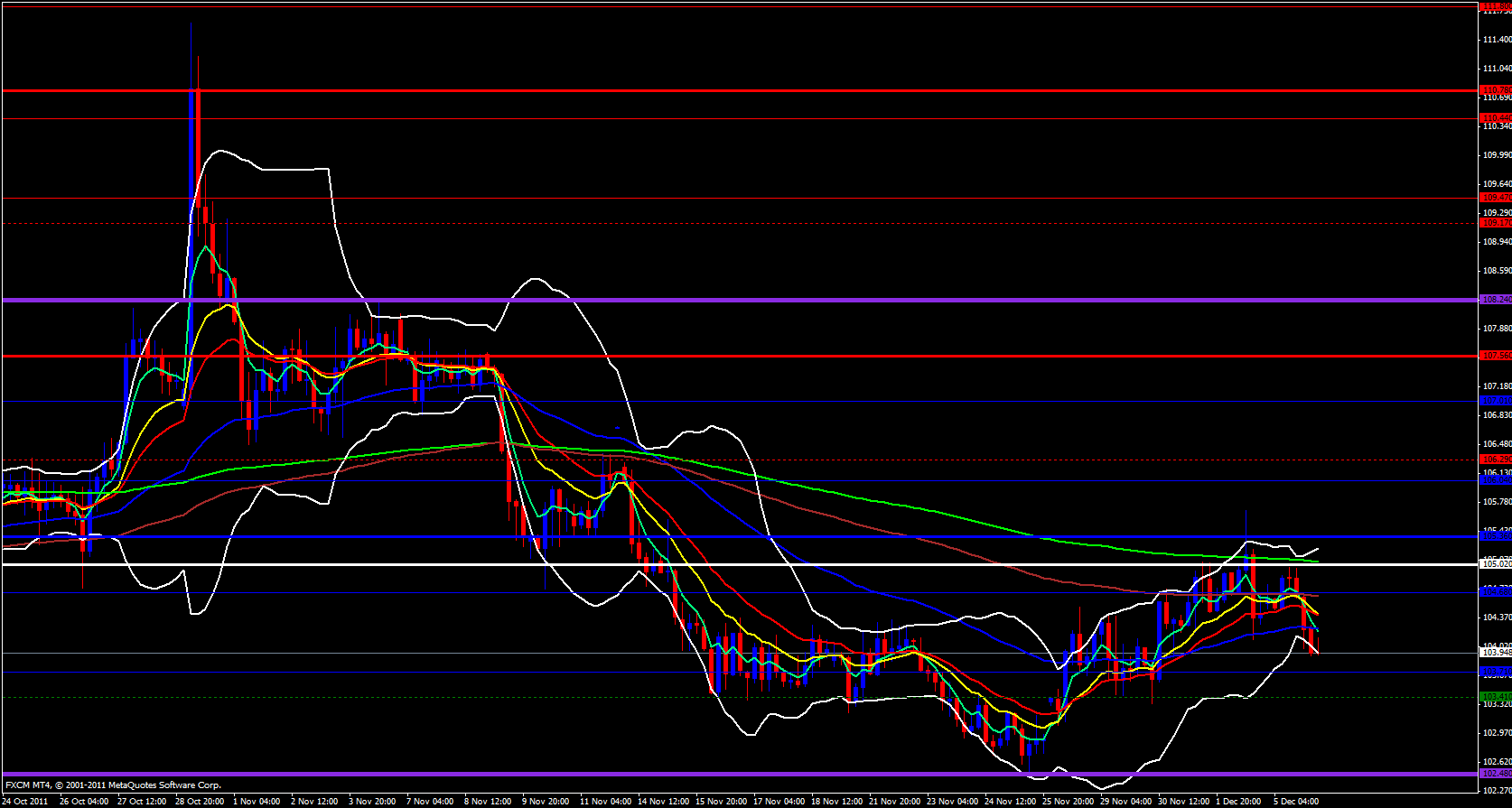 On the 1 hour time frame price is riding down along the 5 ema sharply to the downside and the lower Bollinger band is wide open and pointing down. The 5 ema has nice angle and separation from the 13 ema and both the 5 and 13 ema's have already crossed below the 233 ema. I don't really see much support on this time frame in the way before the weekly M2 at 103.69 so i expect price to keep dropping.