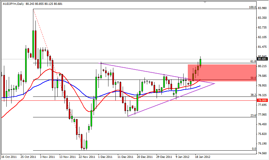 A couple of sessions back, I took a look at the AUD/JPY pair as one that could potentially be ready to make a move. Based upon a triangle that had been forming, the moving averages going sideways, and the pair pressing upwards against a Fibonacci 50% retrace level, I thought that perhaps the move was coming quickly, and it appears that it did in fact happen.