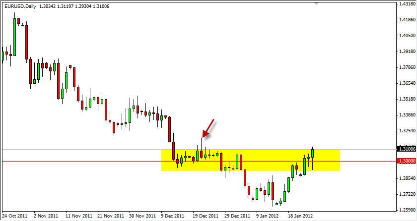 The breaking over the 1.31 level is very important on its surface. The move was certainly impressive as the original move was a drop. However, the pair did regain a lot of footing, but there will be many questions going forward, and while the yellow box on the chart is now broken above, I actually want to see the markets get above the shooting star that is at the top of resistance in order to feel comfortable going long at this point. It appears that there is still a lot of possible headwinds in both directions, and the headlines will continue to cause problems. If you want to short the Dollar, there are other currencies that will do better than the Euro. (Think commodity currencies as an example.)