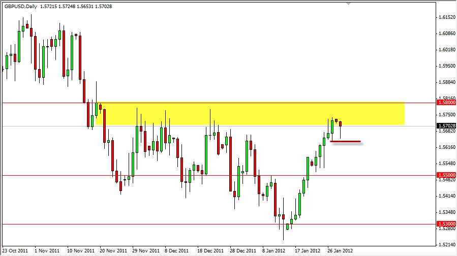 The chart is at an interesting place currently. The rise has been parabolic as I mentioned before, and to be honest – quite impressive. The pair has seen all of the recent selloffs reversed over the last couple of weeks, and the Monday session was no different. In fact, the 1.57 level held as support, and it formed a hammer.