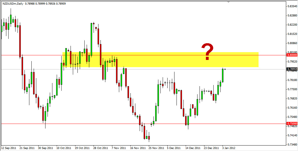 I believe that the area just above will offer a selling opportunity in the near future. The 0.80 level is a big one for this pair, and a daily close above it would prove me wrong, and show real strength in this pair. I am personally waiting to see how the next day or two closes in order to place the next order in this pair. A shooting star somewhere between here and 0.80 on the daily chart would have me selling. The gap form the beginning of November still hasn’t been closed completely, something that is very rare in Forex as well. This is another reason for my bearish sentiment in this pair. Overall, I anticipate the 0.80 and 0.75 levels to be the boundaries in the next few weeks if not months.