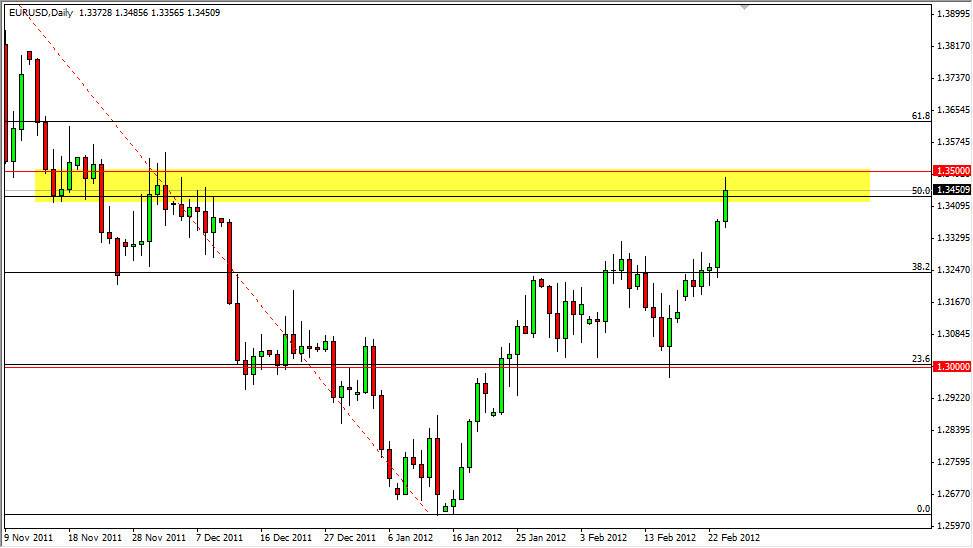 I see this area as a potential barrier that will cause a pullback, and I believe that over the next couple of sessions we will see consolidation between the 1.3250 and 1.35 levels as the pair simply is far too headline driven for most traders to feel comfortable being involved with for more than short term trades.