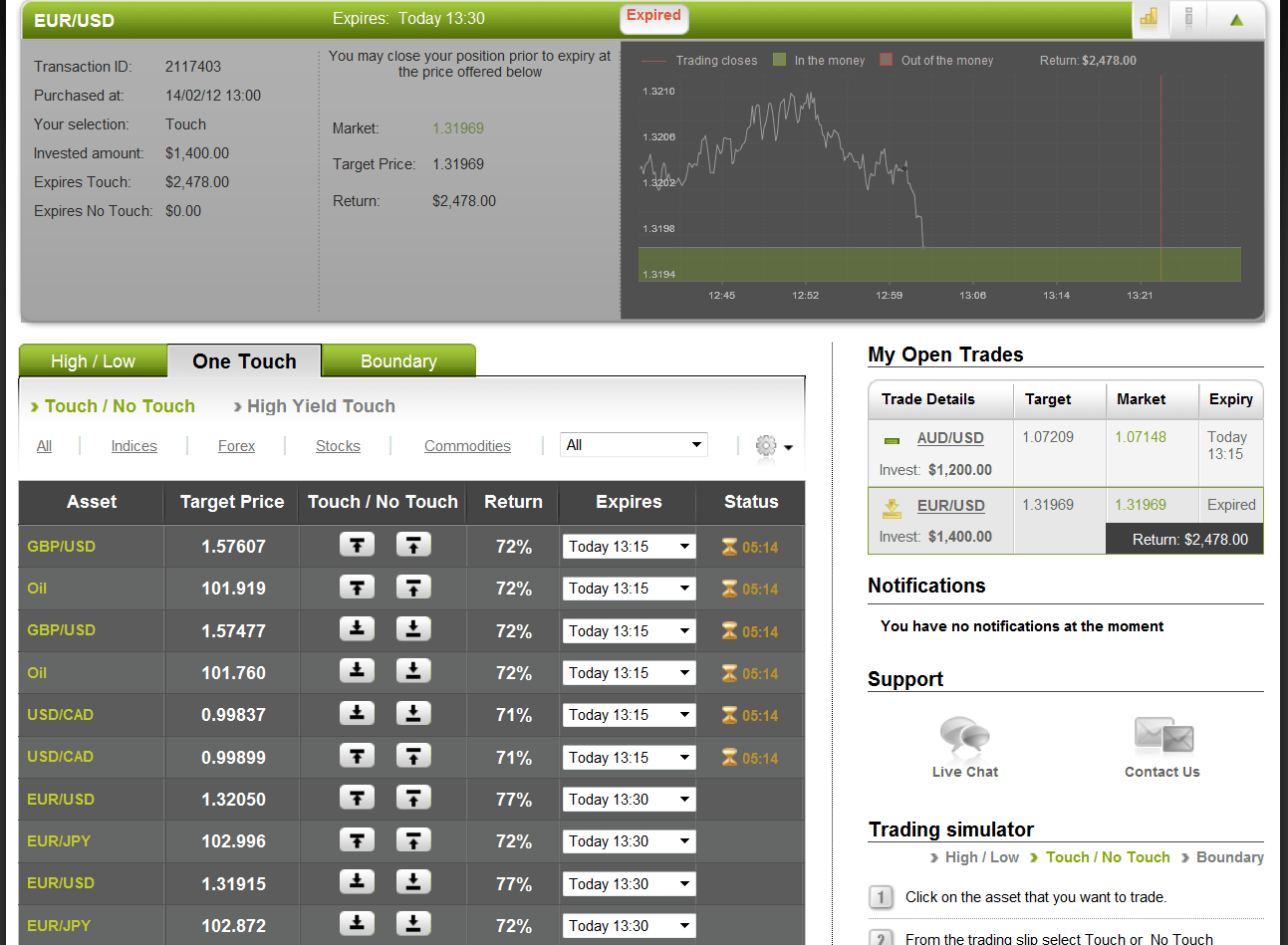 I logged in the OptionFair™ binary options trading platform and the market price for the EUR/USD 1.3203, so I decided to trade 1400$ on the “Touch Down” instrument. This kind of option has a return of 77% if the option hits the strike price prior to expiry.