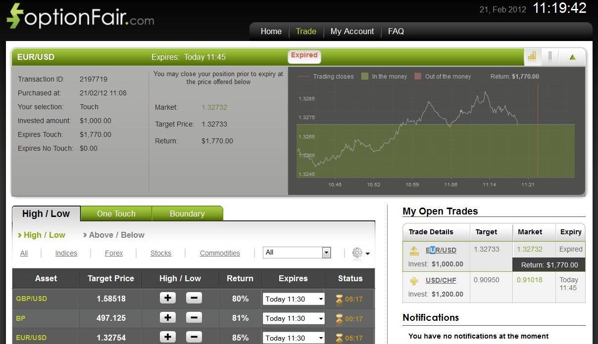 With the optionFair™ Binary Options Trading Platform, I traded with $1,000 on the “Touch Down” instrument. This kind of option has a return of 77% if the option touches the strike price prior to expiry, I could get a return of $770 on my investment. The market price for EUR/USD at the buying time (11:08) was 1.32802 and the target price was 1.32733. The EUR/USD price hit the strike price in less than 12 minutes and I won the position, earning $770 in a short time!