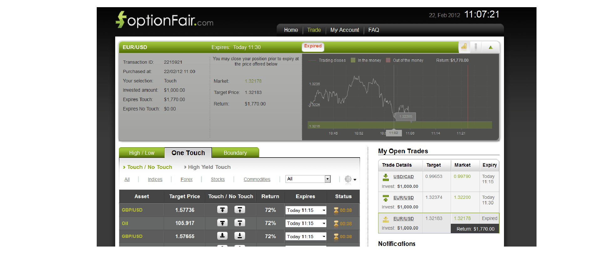 With optionFair™ Binary Options Trading Platform, I traded with $1,000 on the “Touch Down” instrument. This kind of option has a return of 77% if the option touches the strike price prior to expiry. The market price for EUR/USD at the buying time (11:00) was1.32274 and the target price was 1.32183. The EUR/USD price hit the strike price in less than 7 minutes, and I won the position earning $770 in a very short time.