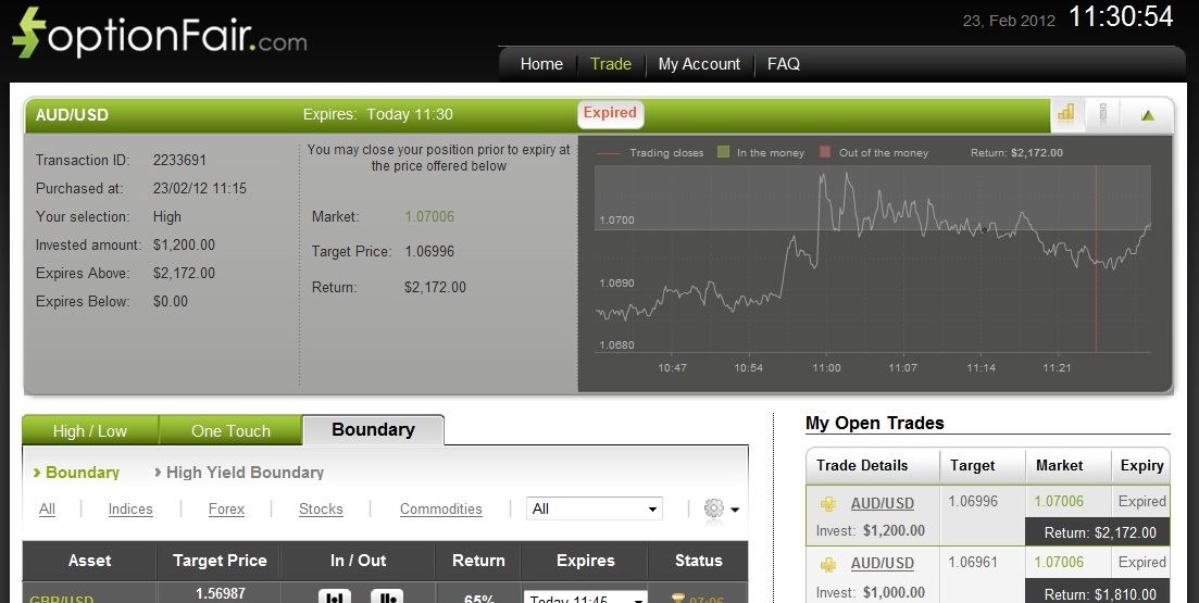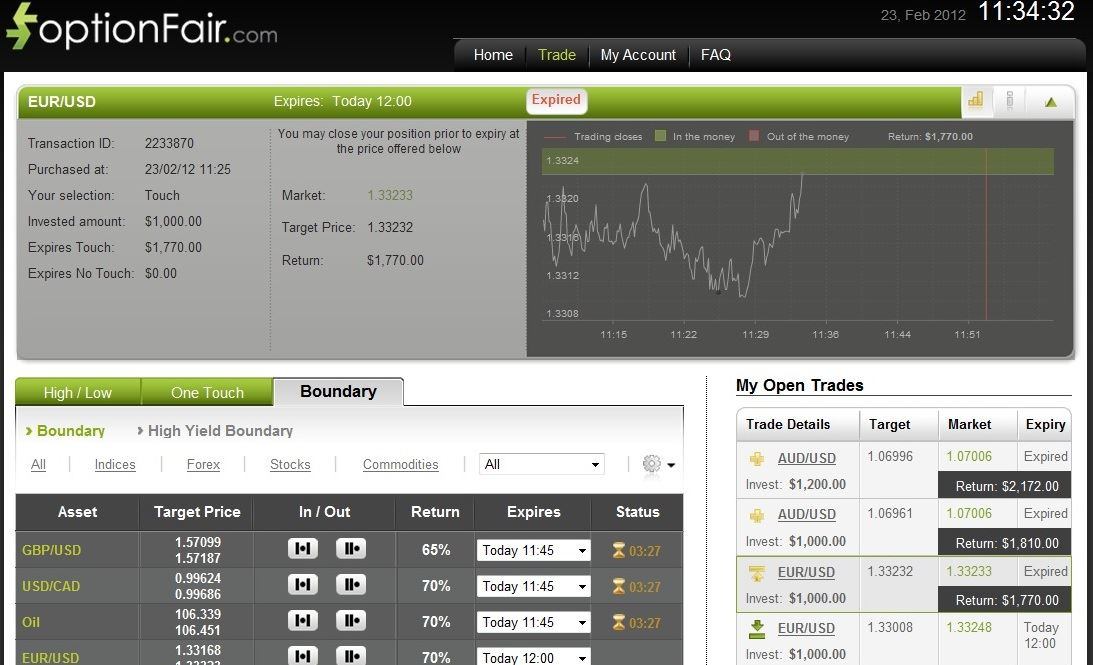 With optionFair™ Binary Options Trading Platform, I traded with $1,000 on the “Touch” instrument. This kind of option has a return of 77% if the option touches the strike price prior to expiry. I could get a return of $770 on my investment. The market price for EUR/USD at the buying time (11:25) was 1.33109 and the target price was 1.33232. The EUR/USD price hit the strike price in less than 11 minutes, and I won the position earning $770 in a very short time.