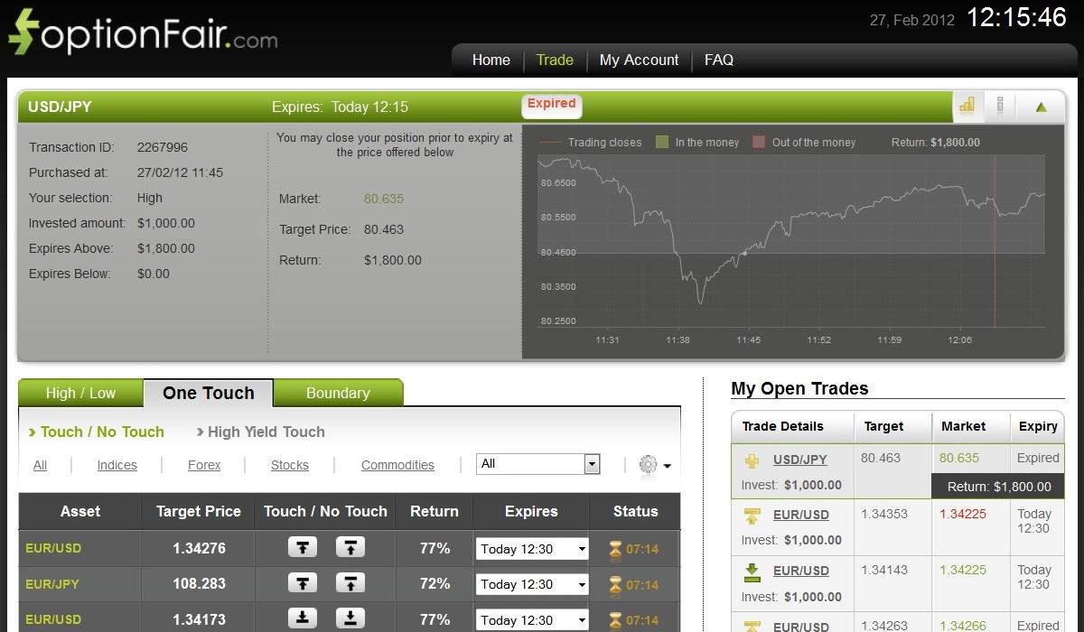 With optionFair™ Binary Options Trading Platform, I traded $1,000 on the “Touch” instrument. This kind of option has a return of 77% if the option touches the strike price prior to the expiry. The market price for the EUR/USD at the buying time (12:09) was 1.34204 and the target price was 1.34266. At 12:11 the market hit my target price and I won $770 in 2 minutes. Very quick and easy way of making lots of money.