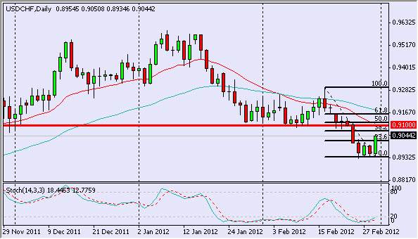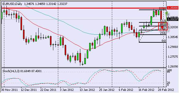 The ECB transferred 530 billion Euros to the EU banks in order to ease the credit problem, but this did not help the European currency to continue the strong momentum it had against the USD and it failed in breaking through the resistance at 1.35. Many traders were waiting for the EUR to correct after the amazing rally that started on mid February and the correction might erase more up to 60% of this rally, meaning that the price might slide under 1.32 before a bullish reversal occur.