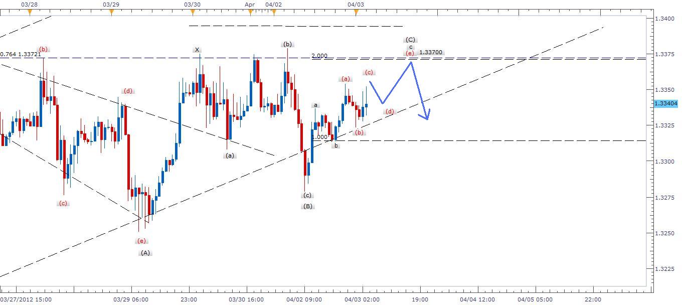 Description: Ending diagonal seems in progress going toward equality to a 100% of wave (a) upward. Expected ends to this wave is 1.33700 before pair change direction downward! However, I didn't click my short call yet waiting for momentum to run out when trend hits expected level! I will post a follow up later on the same pair to update my followers! Best of luck and stayed tuned! Today economic news are critical for our call!