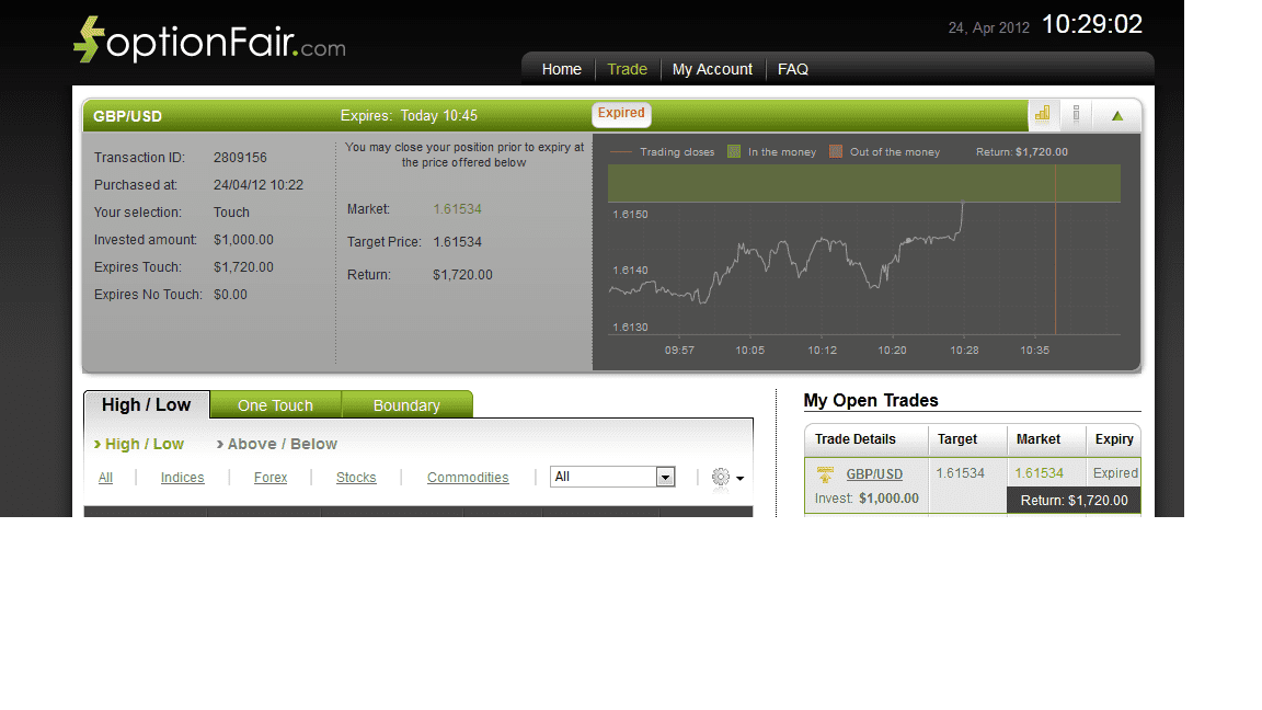 Based on this analysis, I decided to try and make money with $1,000. I wanted to invest. optionFair was my binary options trading platform of choice and so I placed my money on the “Touch” instrument. If this option hits the strike price before the expiry time, I could get a return of 72% on the money invested.