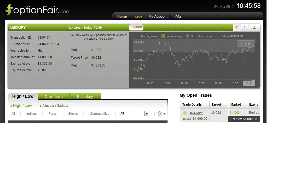 I logged in the optionFair™ Binary Options Trading Platform at 10:24 and I traded $1,000 on the “High” instrument for the expiration of 10:45. This kind of option has a return of 80% if the option expires above the strike price (80.982) at expiry time, meaning I could earn $800 on my investment.