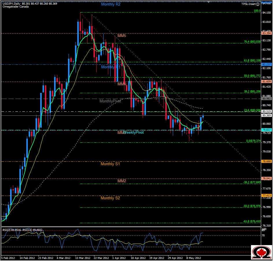 The USD seems to be picking up momentum against numerous pairs lately, including the Japanese Yen. The USD/JPY daily chart has been descending since hitting a 12 month high on March 15th of this year at 84.17, but has fallen and now bounced off of the 61.8% retracement level at 79.80 +/- and has also broken a descending trend-line that has held for 60 days with today's price action, but whether or not it will hold outside of this line is too soon to call. Above the current price of 80.34, we have a solid S/R zone at 80.50 that has established itself as a important level several times since October 2010, as well as the 62 DMA at 80.64 and Weekly Pivot at 80.92. Below the current price, there is something of a vacuum back down to 79.84 and then almost nothing to offer support until the 79.70 level or even the Monthly S1 at 78.668. One scenario is that we see the pair climb to about 81.20 in the next few trading days, then reverse. Or price could easily reverse after re-testing 80.50 and make a new low over the next few days. I am very interested to see how today's price action develops, and will know more after today. For now, I am cautiously Bullish on this pair with possible confirmation coming from price action & the cross of my EMA's, up to at least 80.60. A close above 80.60 will indicate truly Bullish sentiment with my 30 day targets being approximately 82.25.
