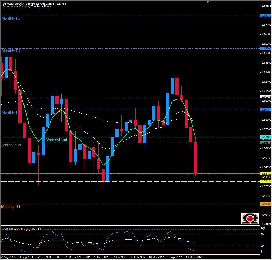 The GBP/USD pair has been in a free-fall for the past 5 weeks. The pair has blown through Support & Resistance zones that have historically given the pair, at the very least, pause but hardly register as speed-bumps this time around. With the Non Farm Payroll being released in the USA later today, and the pair currently sitting on another solid Support level of 1.5375, could this be the level it finally takes a breath at? With growing concern over European financial issues, investors have been flocking to the Greenback once again as a so called 'Safe Haven' which has resulted in the USD gaining strength against most currencies around the globe. But, worse than expected numbers from the NFP could change all that, at least temporarily. If the numbers are negative we could see the GBP, along with many other world currencies regain some ground. However, if the US economy continues to 'steadily improve' as one analyst put it, the GBP could make new 12 month lows before trading closes this week. Currently the pair appears that it may be setting up to form a triple bottom at 1.5300 before reversing, with 1.5300 being a 'line in the sand' for many large institutions. If 1.5300 support fails, there is a technical vacuum below that could see the pair fall as low as 1.5100 very quickly. If prices do reverse, look for resistance at 1.5500 & 1.5590 before re-testing the Monthly Pivot level at 1.5670.