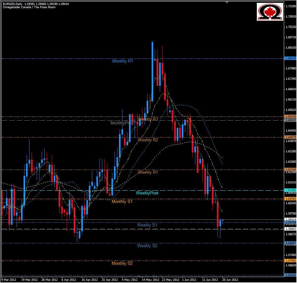 And now for something a little different...the EUR/NZD is definitely not one of the 'major' currency pairs but offers some nice trading opportunities all the same. Yesterday the pair printed a pin bar with a long tail and a close higher than open, after making a higher low on the Daily Chart. The pair was last at this price level on April 13 of this year where it printed a similar candle and then proceeded to climb until May 18 when it reached a high not seen since December 2011. After peaking it fell, pausing only at the 1.6400 level for a 6 day consolidation and has now returned to where it started back in April. With the formation of the Daily Pin Bar, taking into account how price reacted at this level previously, there is a strong possibility that price will reverse and begin trading higher, most likely to the Weekly Pivot at 16108 at least and possibly to the Weekly R1 (also the 38.2% Fibo) at 1.6240. If price does continue to fall and breaks the previous low at 1.58177 the next target will be 1.55889, the all time low for this pair reached in February 2012. With such a strong down trend it can be risky to consider buying, but considering the facts it might just be worth the risk.