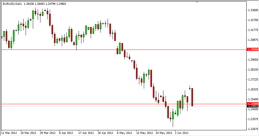 The move on Monday was a strong one, especially considering that we saw a gap get filled and more – something that normally doesn’t happen. The reaction to the Spanish bank bailout isn’t a good one, and it now looks like we are going to fall much more over time. Because of this, I see absolutely no reason to change my strategy at this point. Adding to this mess is the fact that the Greeks are going to be voting again this weekend. In other words – there is a ton of uncertainty again.