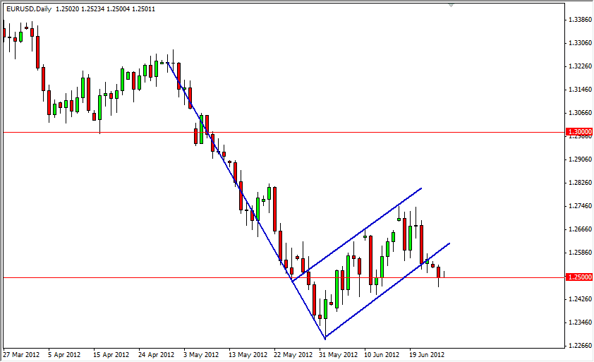 Much like my analysis of EUR/GBP, in this pair we find the market with a potential bearish flag, and a massive round number just below it. This is why I think the 1.25 ultimately will be a big one and having said this – I think it is giving way at the moment. The flag’s pole measures 1,000 pips and this gives us a potential target on the downside of 1.15 or so.