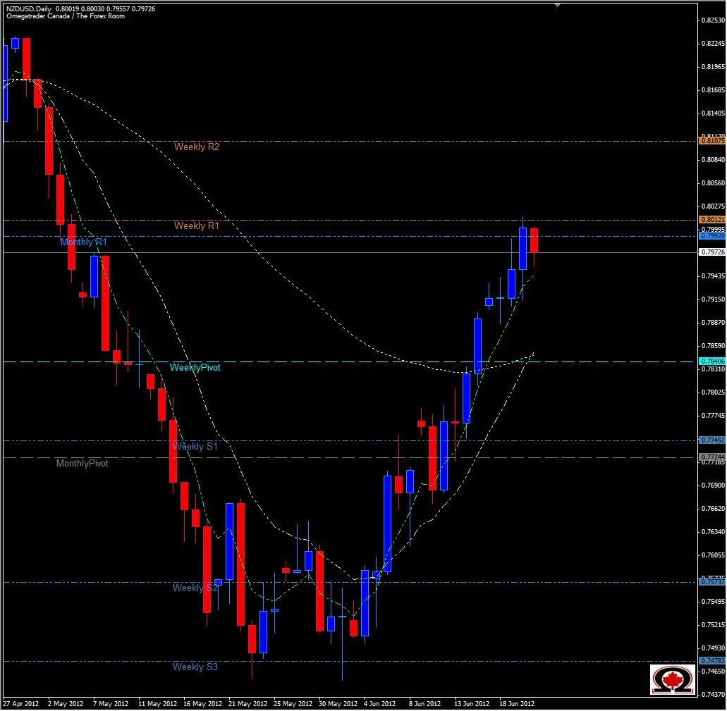 The Kiwi (NZD/USD) continues is march higher after Statistics New Zealand released its quarterly GDP number showing growth of 1.1%, much better than the forecast 0.5%. The NZD rallied against the Greendback immediately after the news was released but has since given back all but about 23% of the gains and appears to be setting up to go lower on a 1-hour chart at time of writing (4PM Sydney Time). The Daily Chart is another story however as the pair has closed above the 61.8% retracement level from the April 12 high of 0.8318 to the June 1st low at 0.7455. It appears to be aiming for 0.8100 which was the floor of a 2 month long consolidation zone between March 05 to May 02 of this year. The pair found itself trading between 0.8100 & 0.8300 for 2 full months and clearly established what will be major resistance for the pair to break through. The pair is currently up against some heavy resistance at 0.8000 with both the Monthly R1 and Weekly R1 converging within 20 pips if each other and if this zone is breached 0.8120 will be the next target. If prices do turn bearish, look for key support at 0.7900, 0.7840 and 0.7745.
