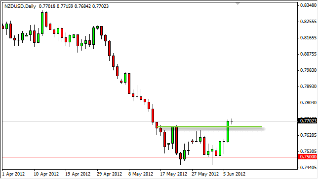 The market looks like it wants to run, but there are a couple of levels above to worry about for the bulls. The 0.78 level looks like it could be resistive, and will more than likely produce some kind of barrier for the bulls to overcome. The 0.80 level is even more imposing, and I have a hard time believing that this pair will break above it.