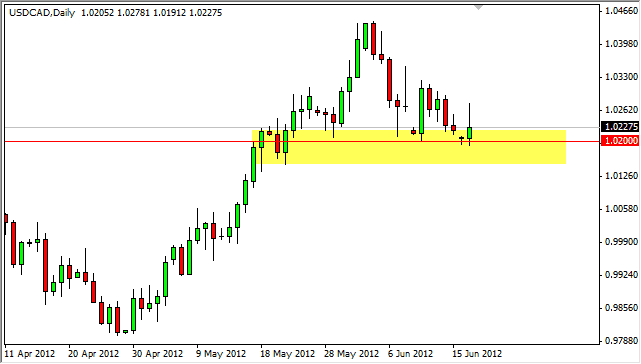 USD/CAD continues to be a focus of my trading lately, as the economic situation worldwide has put the oil markets into the forefront of the trading world. In fact, it even appears that the economic situation is finally gaining the upper hand to headlines and rumors as the Iranian situation simply cannot move the price of oil any longer. Because of this, the USD/CAD appears to be following more of a “Risk on, Risk off” mode now – just like oil itself.