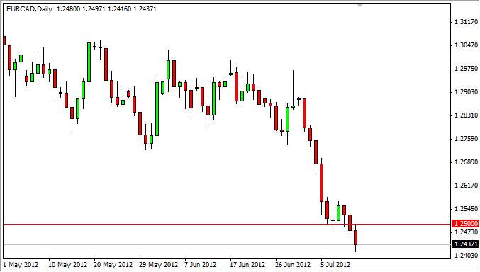 The breaking of the 1.25 level is significant as that level has been supportive several times on the monthly chart. The fact that it is given way and we are closing below it by a good 75 pips or so, does suggest that perhaps there is a serious move lower coming. This is actually a long-term trade, as this could be a cyclical move. You'll notice that the previous for candles hovered just above the 1.25 level, we had broken below it on Wednesday, and then retested it earlier on Thursday. This looks like a classic breakdown in support.