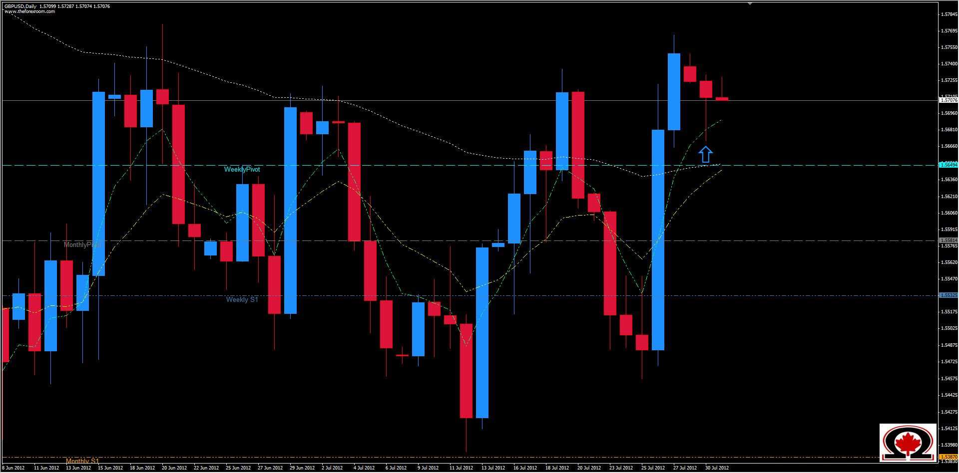 The GBP/USD took back roughly 267 pips from the USD last week, closing above the Weekly Pivot and 62 Day Moving Average. This is only the 2nd time since May 15 that price has closed on the positive side of the 62DMA in favor of the Sterling. The pair has been trading in a range below 1.5475 and above 1.5390 for the most part since the beginning of June and is prime for a break out but has been unable to break above the 50% retracement level of the Bearish move down from the years high at 1.6300, a level not seen since August 2011. Since hitting the 6 month low on June 1st of this year at 1.5267 the pair has struggled to gain any real momentum backed by the Bulls. Now the pair faces the challenge of resistance once again at the 1.5784 area once again, making this the 4 attempt since that 6 month low. Yesterday we saw price reverse slightly after last week's rally, but only to 1.5671 and intersecting with the 13 Day Moving Average but not closing below it. The 5 & 13 DMA's have crossed and spread apart indicating that higher prices are possible and the candle that printed yesterday, while Bearish, is usually considered a reversal or continuation candle depending on where it prints. This one printed on a strong support level at 1.5700 and seems to indicate a Bullish continuation. If the pair can clear resistance at 1.5784 & 1.5841 especially, there is an 200 +/- pip technical vacuum above just waiting to be filled by price action. On the way up there will be additional resistance at 1.5905 & 1.5958, but adding all of the factors together creates a strong argument for higher prices to come, regardless of additional resistance. To the downside, Support abounds as well. In addition to the Weekly Pivot at 1.5649, the Monthly Pivot is at 1.5581 as well as the Weekly S1 at 1.5532. I am cautiously Bullish on this pair.