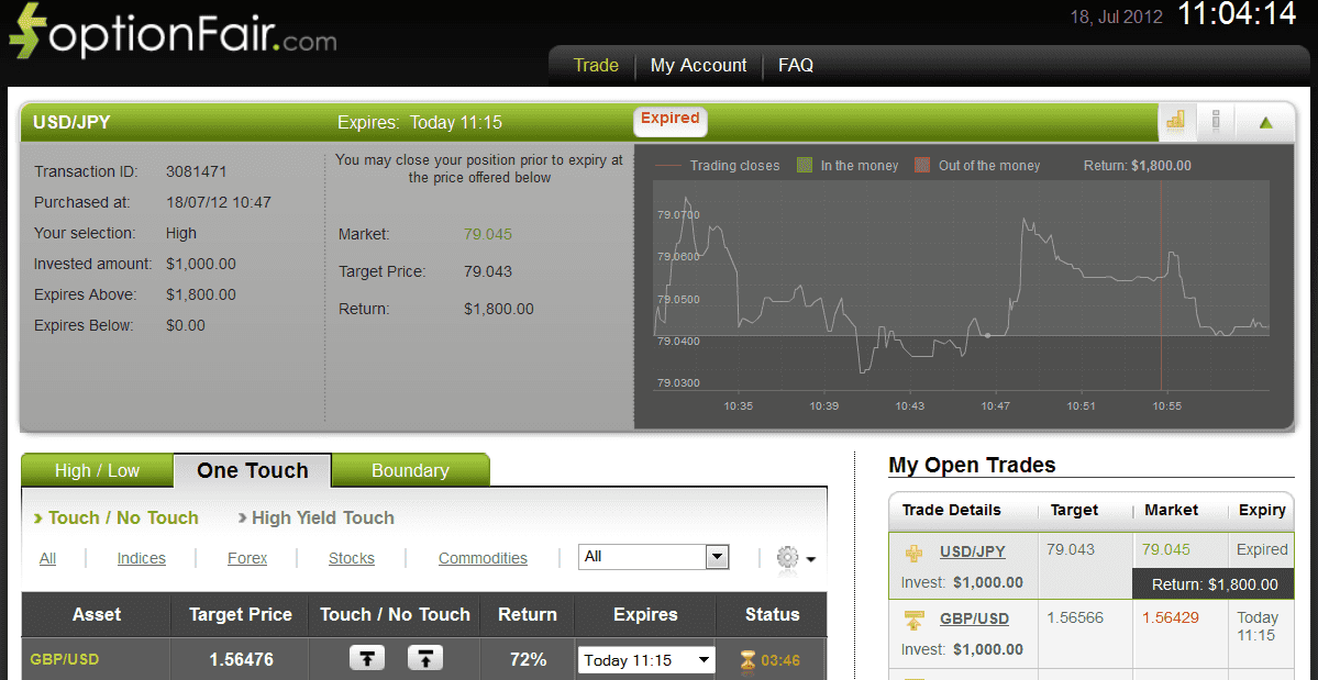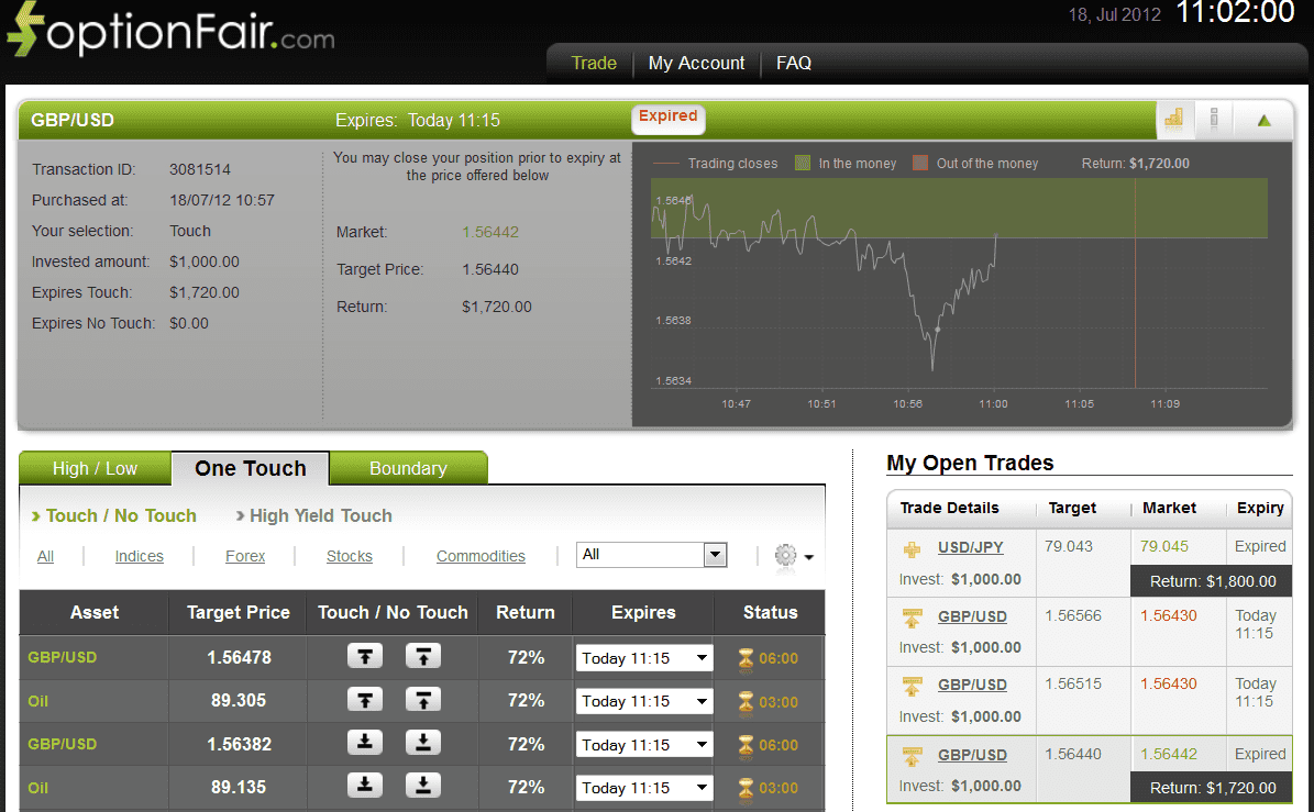With optionFair™ Binary Options Trading Platform, I traded $1,000 on the “Touch” instrument. There is a 72% return, if the option touches the strike price prior to the expiry. Meaning if the signal is correct, I could get a return of $720 on my investment.