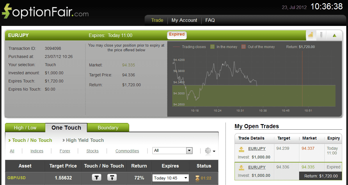 The market price for the EUR/JPY at the buying time (10:26) was 94.411 and the target price was 94.336 for the expiry of 11:00. At 10:36 the market hit my target price and I won $720 in just 10 minutes!
