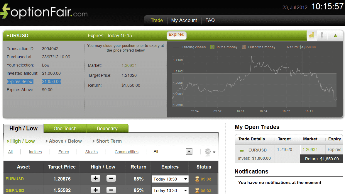 I logged in the optionFair™ Binary Options Trading Platform and traded $1,000 on the "Low" instrument. This kind of option has a return of 85% if the option will close below the strike price, meaning that if the signal is correct I could get a return of $850 on my investment.