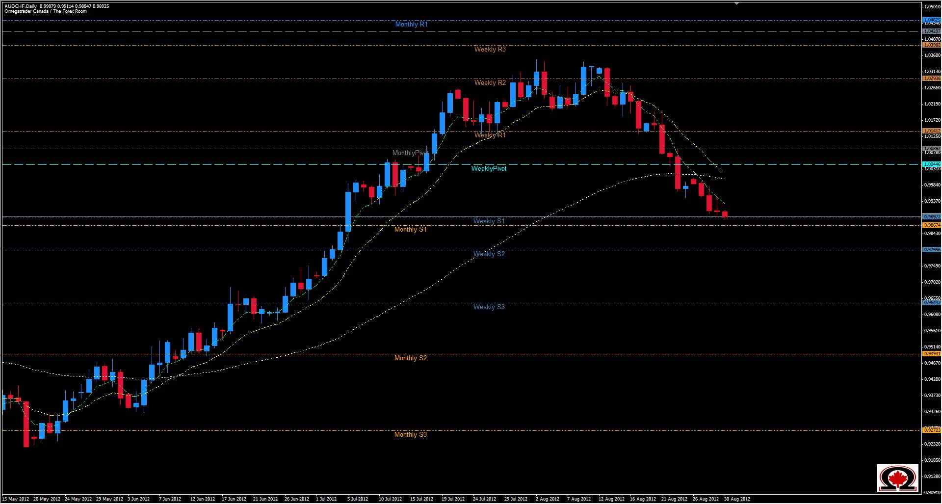 The AUD/CHF has broken a key support level at 0.9950 and entered a Technical Vacuum, well below the 62 Day Moving Average at 1.0003 . The pair has been trending lower since making a new four and a half year high on August 02 of 1.0348. The previous high up until August second was set in November 2007 at 1.0823 before it fell over 3800 pips in 11 months to an all time low of 0.6929 in October 2008. The pair appears to have formed an inverted head and shoulders pattern on the weekly chart and is currently heading for another key support level at 0.9810 which is a series of closes on the weekly chart going back several years. There are some hurdles in the way in the form of the Weekly S1 at 0.9892 and Monthly S1 at 0.9867, but it is quite possible that we will see this pair trade at least as low as the weekly S2 of 0.9795 which lines up almost perfectly with the 50% Fibo for the last 120 days of price action. If prices turn bullish look for intraday resistance at 0.9917, 0.9938 & 0.9967. Intraday support can be seen at 0.9888, 0.9868 + 0.9838. This bear is highly bearish at the moment and appears to be just getting started with the potential to reach as low as 0.9575 in the next 30 days.