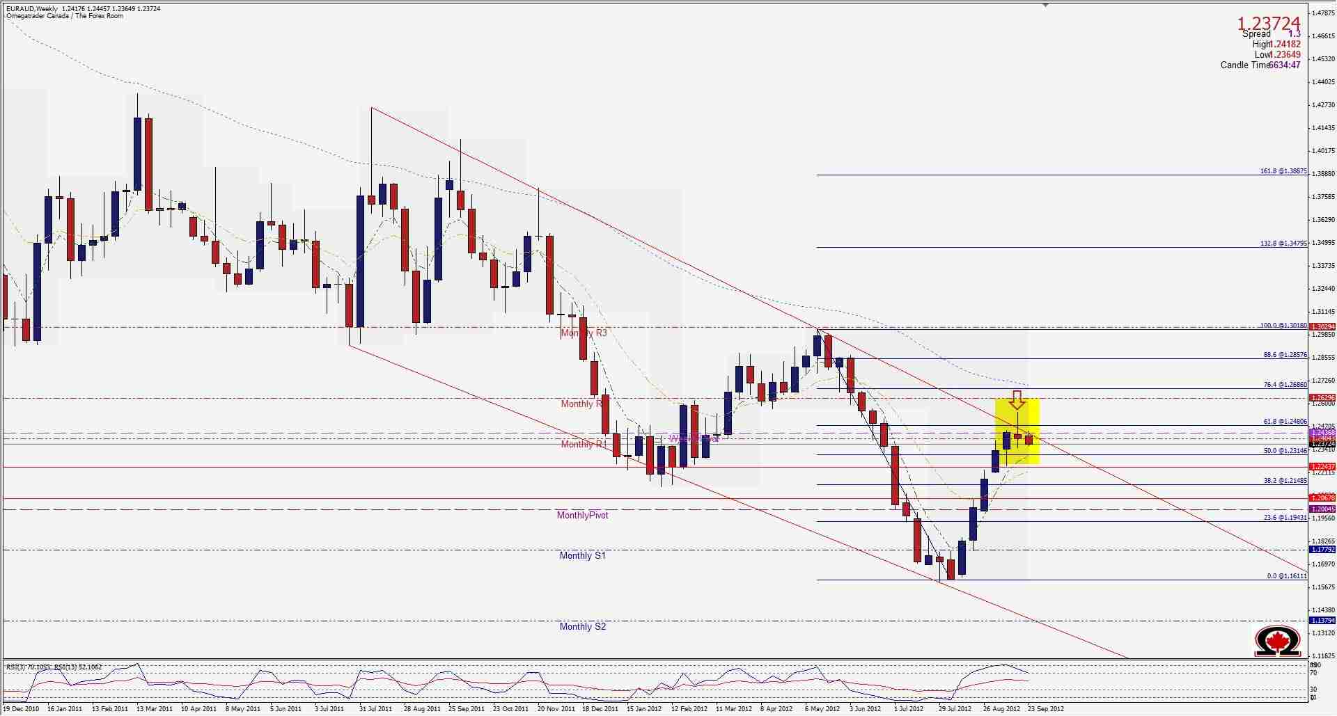 Yesterday I wrote my analysis on the AUD/CHF, and today we have its mirror image, the EUR/AUD. This pair reached a high last week of 1.2552 and reversed to close the week at 1.2404, forming a weekly pin bar reversal candle in the process. The rejection came at a strong level of Resistance where we see several types of said Resistance coming into play. The reversal level is the top of a descending channel that began forming back in August 2011 and has since been printing lower highs with 5 'touches; confirming the upper channel line. The reversal also came at the 61.8% retracement level for the bearish run from 1.30180 to the start of the recent bullish run at 1.1611, 7 weeks ago. Combine these factors with the Monthly R1 and Weekly Pivot at 1.2436 + 1.2404, and the pair didn't stand a chance from a technical perspective. Now we see the pair falling at a modest pace but has not broken last week's low at time of writing. If it does, there is a strong possibility that we will see a bearish turn over and watch prices fall further. Resistance will come in the form of more Fibo levels such as the 50% at 1.23146, and the 38.2% at 1.2148. There are also some previous closes from January-February at the area around 1.2244 and these could offer support too. The ultimate target will most likely be the bottom of the channel that intersects somewhere around the Monthly S2 way down at 1.1379.