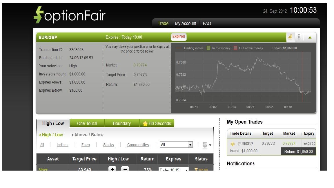 I logged on to my optionFair binary options trading account and I traded $1,000 with a 77% return offered on the “Touch” instrument. This means that if the option touches the strike price prior to the expiry, I could get a a 77% profit ($770) on my investment.