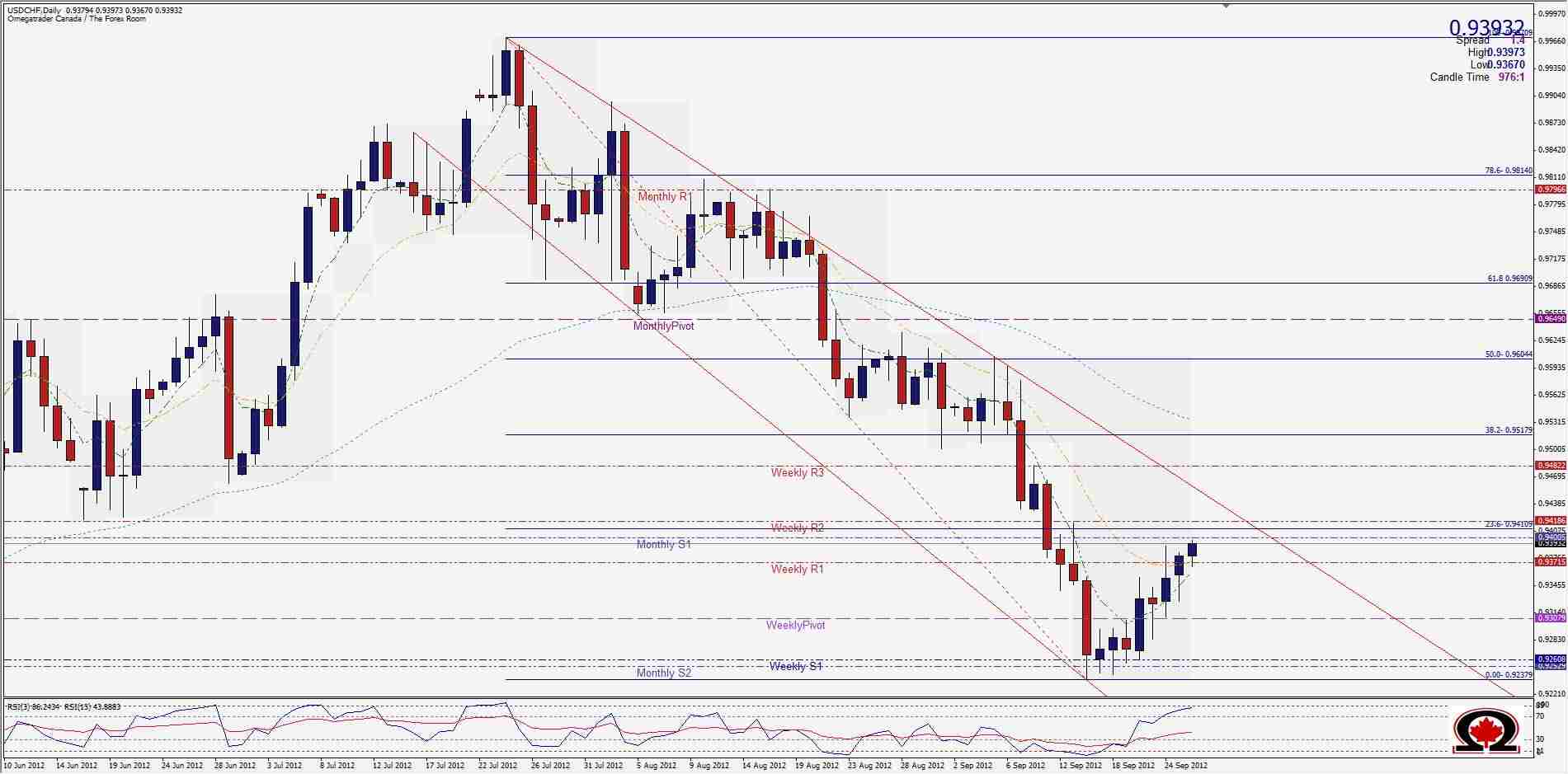 The USD/CHF is maintaining its Bullish momentum during Asian trading after retesting the Weekly S1 at 0.9260 before climbing to its current price at 0.9391. The pair is most likely heading for the 0.9450 level, the lows from June. Resistance is strong at this level with a descending trend line intersecting with the Monthly S1 (now acting as resistance) at 0.94005 & The Weekly R2 at 0.94186. The trend line itself is made up of at least 9 'touches' and defines the upper side of a descending channel that began to form when prices reached the 19 month high at 0.9971 on July 24 of this year. The lower channel line is not as well defined but saw price fake a break lower on September 19, stopping at the combined Weekly S1 / Monthly S2 around 0.9260. Prices then consolidated for the next 4 days and broke back inside the channel 4 days ago. Targets will be the previously mentioned 0.9450 level which is also a 23.6% retracement level for the Bearish Channel, and then most likely the 0.9500 area with the Weekly R3 offering resistance once more time at 0.9482. Finally, with the daily RSI heading into the 'overbought' territory we should expect to see a pull back, possibly off of the 0.9400 level before making another push for the top of the channel.