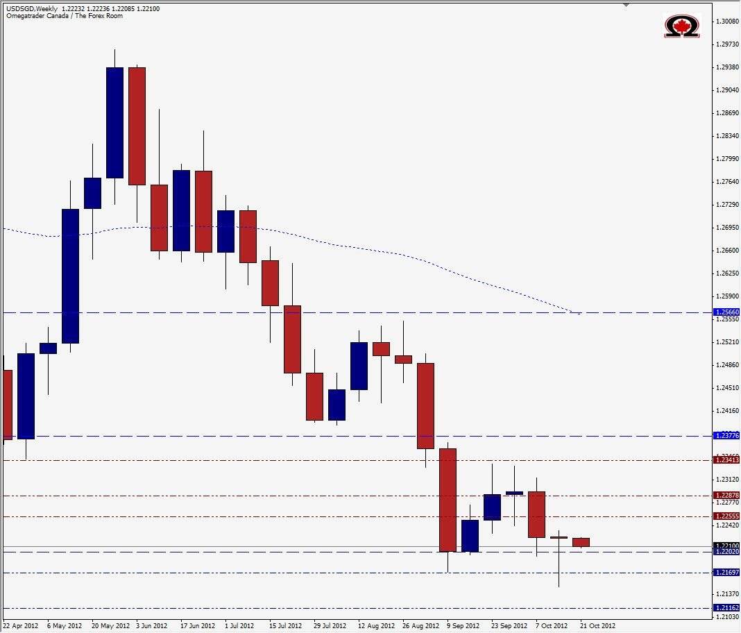 The Singapore Dollar has been gaining on the US Greenback for some time now, hitting an all time high against the Greenback in July of 1.1987. Price has returned to this area after climbing over 1100 pips in August & September and last week attempted to push the chart lower once again but traders rejected the idea, possibly temporarily of a sub 1.2150 USD/SGD with last week's close of 1.2231. The result was a Weekly Pin Bar, or Doji actually. Some call this a 'Dragonfly' Doji because of its long tail. The potential or meaning for traders is basically the same however as it often means price will reverse and head in the opposite direction...in this case, higher.