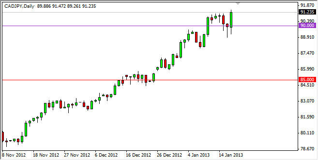 The CAD/JPY pair had a very strong showing during the Thursday session and managed to make a fresh new high. This makes sense though, because the light sweet crude market itself broke out to the upside. This pair is the ultimate petroleum sensitive market as the Japanese import 100% of their oil, while Canada of course is an exporter.