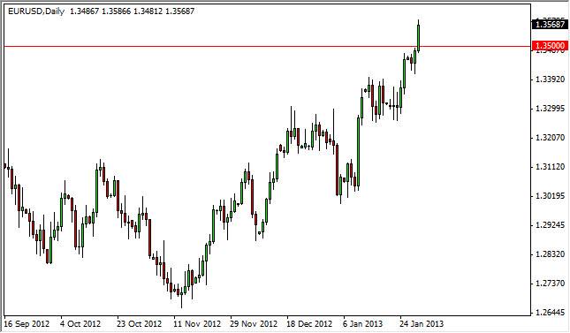The EUR/USD pair had an extraordinarily strong showing on Wednesday, as we finally broke above the 1.350 level. This area has been of particular interest to me, and just about everybody else in the Forex world, as it represents the neckline of a massive inverted head and shoulders. This inverted head and shoulders measures 15 handles fall, and as a result this opens up the door for a 1500 pip move.